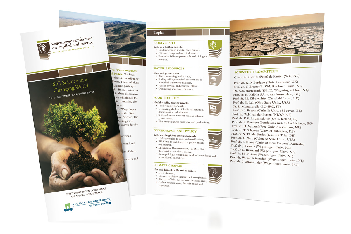 Voor deze driejaarlijks terugkerende bodemkundige conferentie, die in 2011 voor de eerste keer in Wageningen gehouden werd, heb ik de visuele identiteit ontworpen. Het congres draait om het belang van bodemkundige kennis bij het aanpakken van mondiale problemen, zoals bijvoorbeeld klimaatverandering. De conferentie was onderverdeeld in vijf thema’s. Een voorbeeld van de verschillende folders en flyers die ik voor de conferentie ontworpen heb.