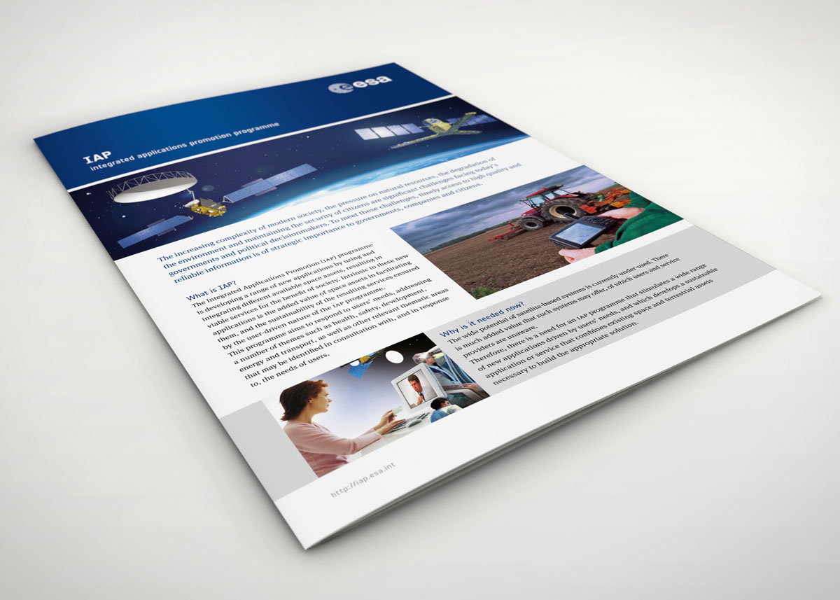 Voorbeelden van de fact sheets en brochures die ik regelmatig voor de ESA telecom programma’s ontwerp.