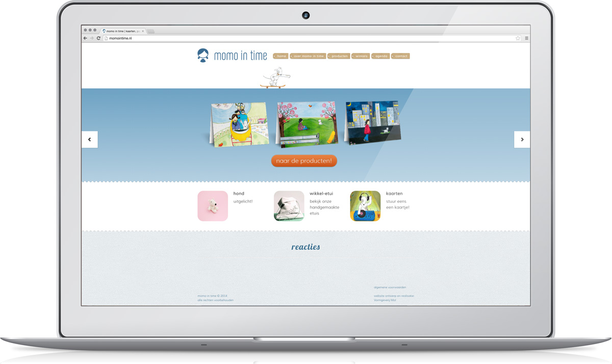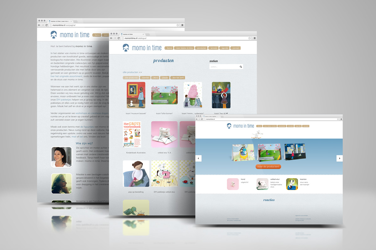 Website voor momo in time. De site voldoet aan de W3C HTML 5 / CSS 3 webstandaarden en is door de klant zelf te beheren.momo in time is het merk waaronder de Amsterdamse illustrator Tanja Visser haar werk publiceert en verkoopt. Dit gebeurt vooralsnog voornamelijk in de vorm van luxe wenskaarten en andere papierwaren. De doelgroep van haar produkten bestaat hoofdzakelijk uit (jonge) vrouwen en kinderen.